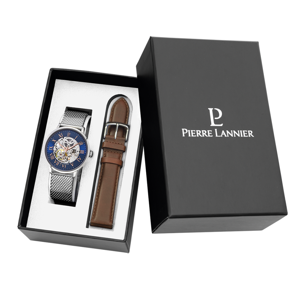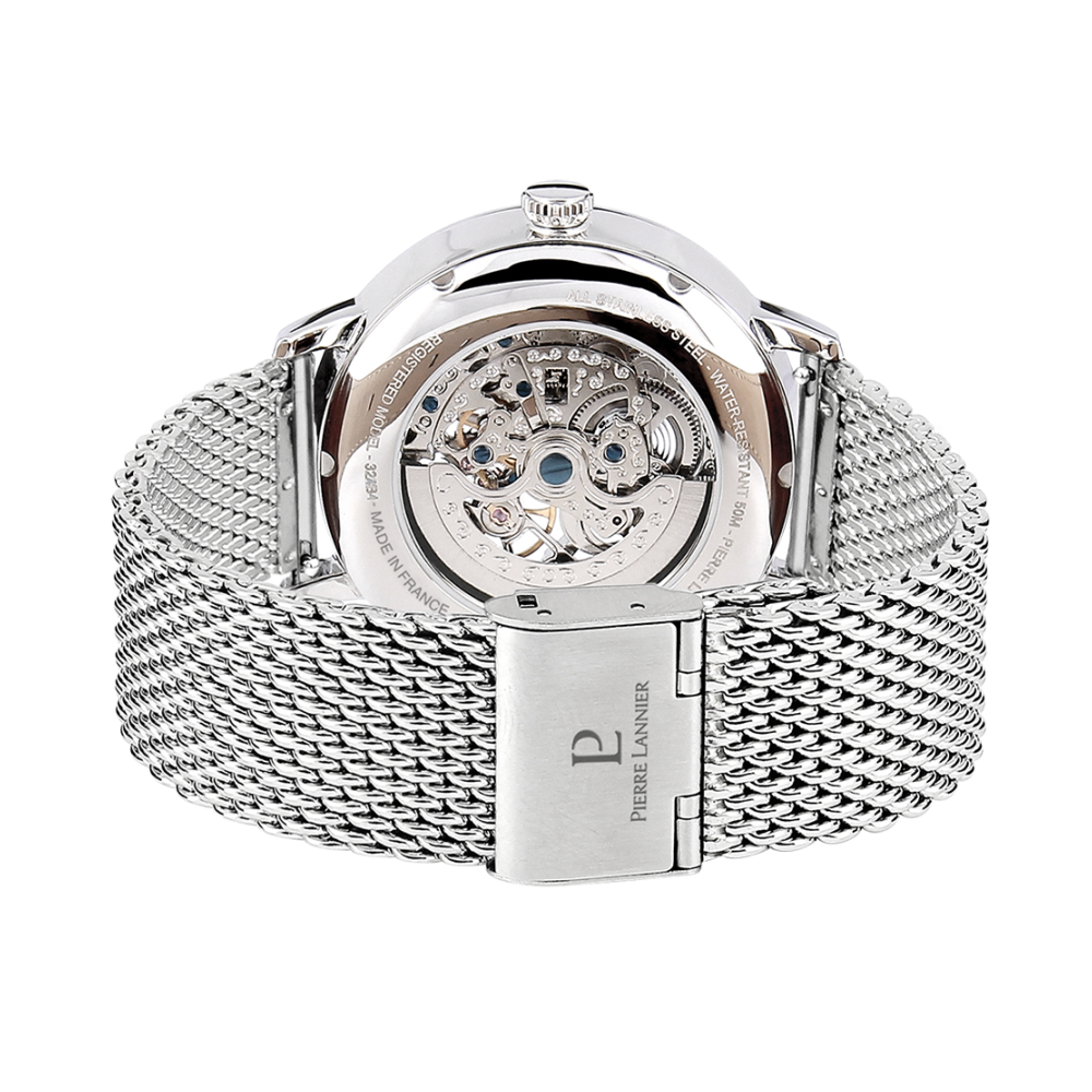 Coffret AUTOMATIC argenté milanais. Chaque montre est livrée dans un écrin spécifique griffé au nom de Pierre Lannier et bénéficie d'une garantie internationale de 2 ans. Montre fabriquée avec beaucoup d'amour en France (67 - Bas Rhin).