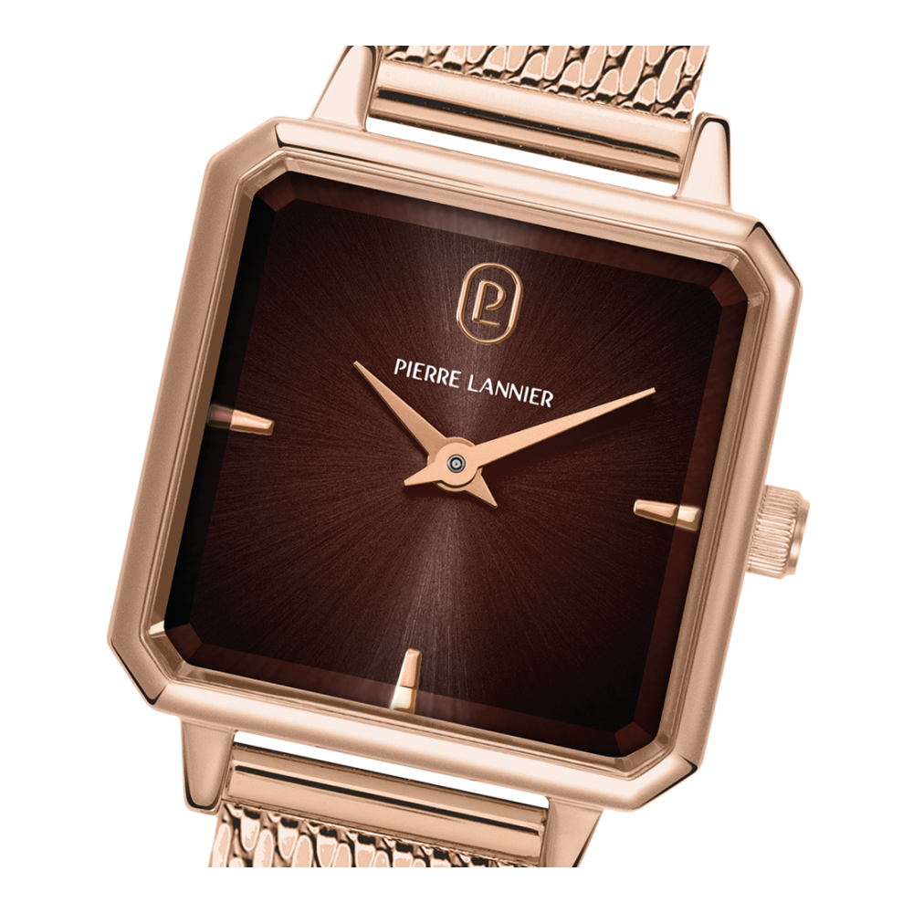 LEONOR doré rose milanais. Chaque montre est livrée dans un écrin spécifique griffé au nom de Pierre Lannier et bénéficie d'une garantie internationale de 2 ans. Montre fabriquée avec beaucoup d'amour en France (67 - Bas Rhin).