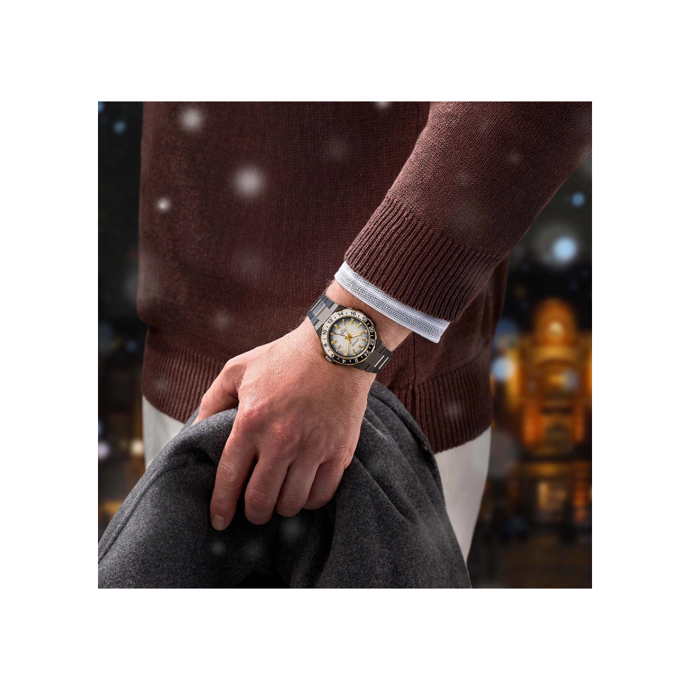 Équipée du calibre 9054, elle propose un affichage sur 24 heures, une aiguille dédiée au second fuseau horaire, une fonction date ainsi qu’une protection anti-magnétique.
