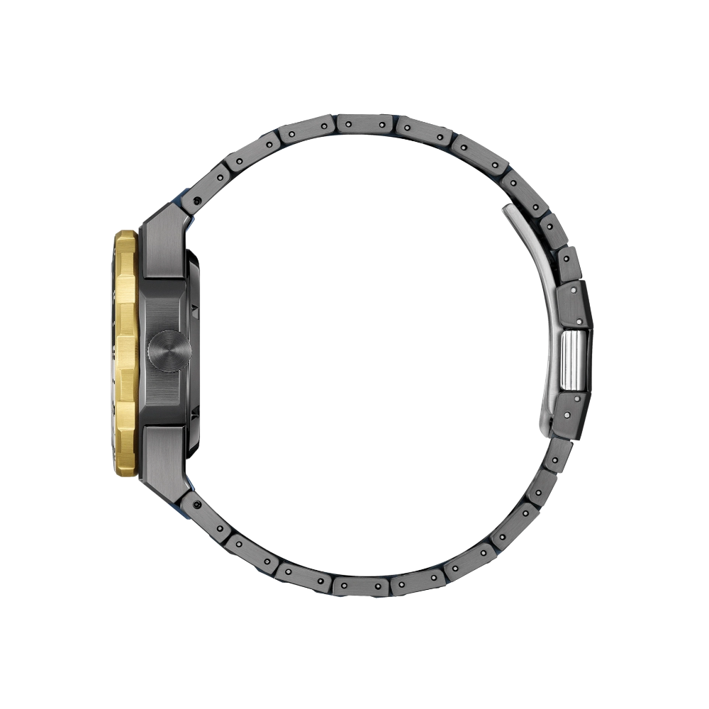 Le bracelet en acier massif, muni d’une boucle à double sécurité, assure un maintien fiable.