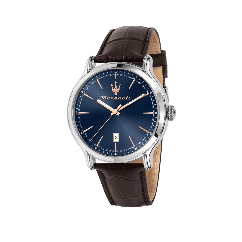 Montre Homme Maserati Epoca Réf.R8851118016 , bracelet cuir façon aligator marron, boite acier, fond bleu, date à 6h.